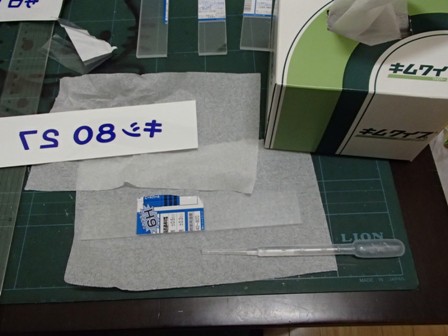 透明ラベルは印刷面全面に「のり」がついているようなので、接着面からあふれた水が印刷面に付着しないよう、スポイトで調整して少量を滴下。